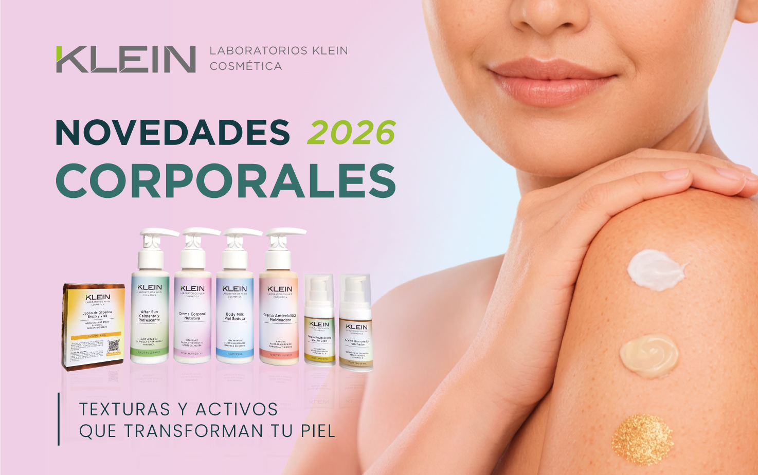 En 2026, el cuidado corporal se convierte en un espacio clave para las marcas que buscan ofrecer algo más que hidratación: experiencias sensoriales, texturas trabajadas y resultados visibles desde la primera aplicación. El cuerpo se cuida, se ilumina, se reconforta y se disfruta.En Laboratorios Klein Cosmética hemos desarrollado una selección de fórmulas corporales diseñadas para acompañar nuevas rutinas y momentos de uso: desde el cuidado calmante y nutritivo hasta propuestas glow, revitalizantes o pensadas para el masaje profesional. Productos versátiles, eficaces y alineados con las tendencias que marcarán el cuidado corporal en 2026.